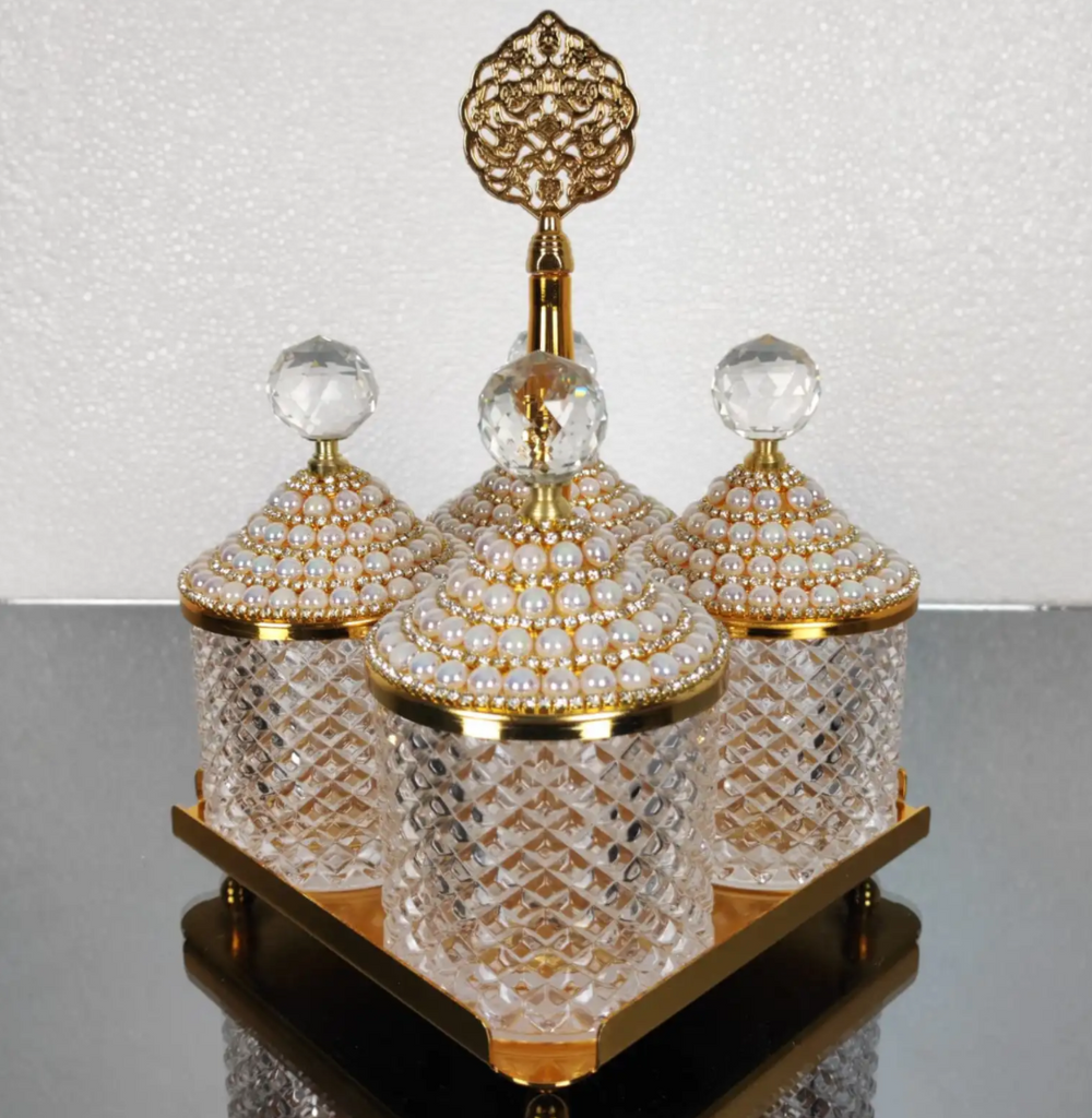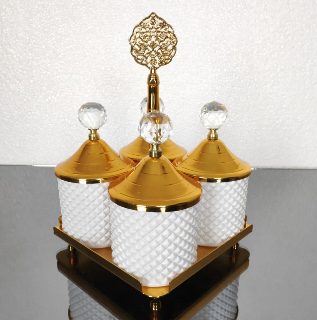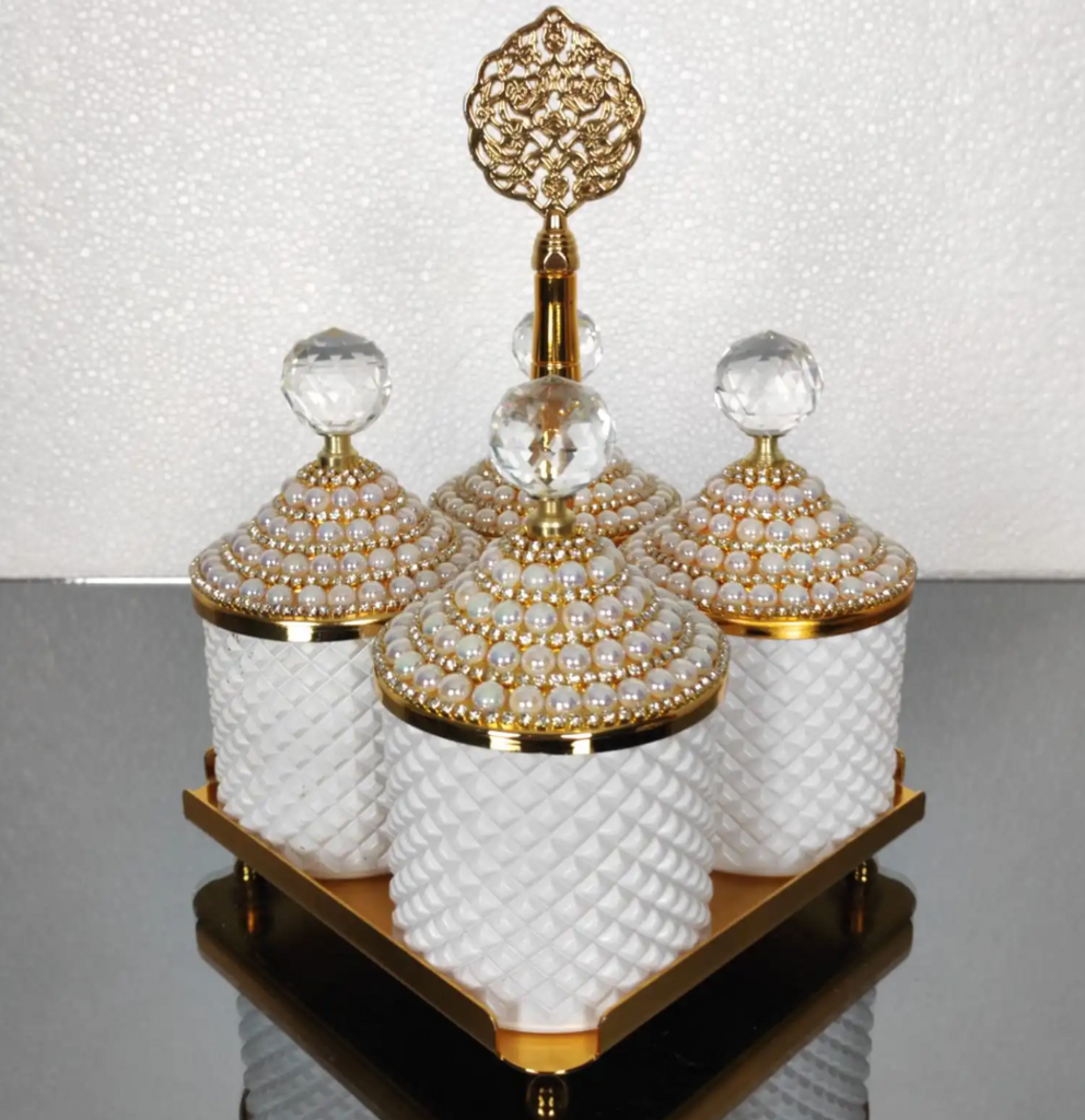 Gold and White Pearl 4 Pcs Spices Hammered Canister with Stand Set