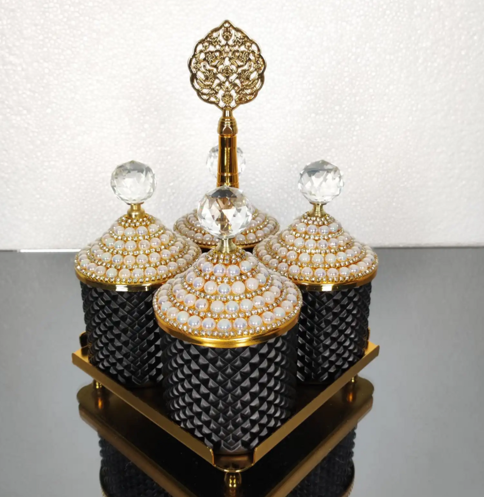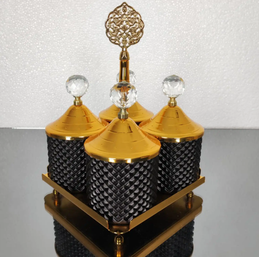 Gold and Black Pearl 4 Pcs Spices Hammered Canister with Stand Set