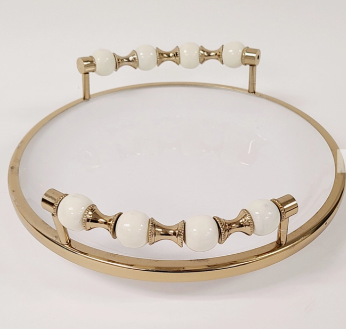 Gold and White Round Tray with Beaded Handles
