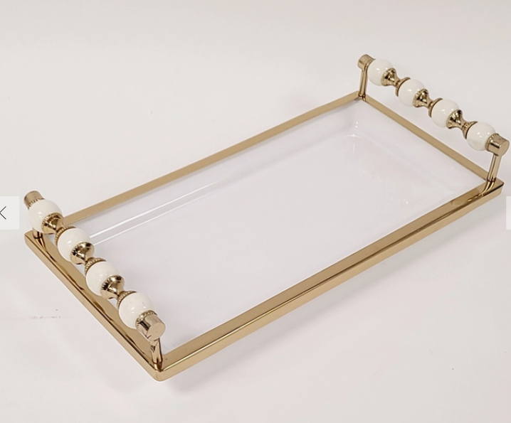 Gold and White RectangularTray with Beaded Handles