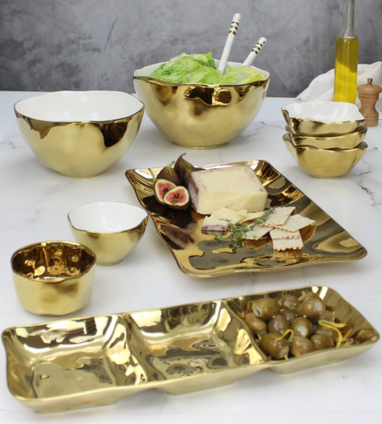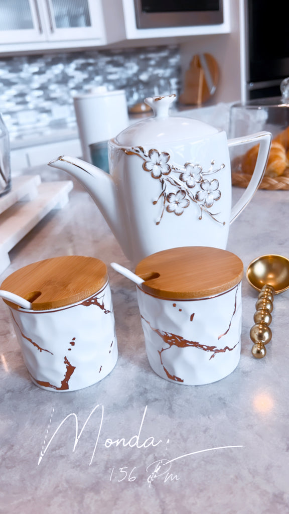 Metallic Gold Marble Print Spice Jars with Spoons and Wooden Lid With Tray (set of 3)