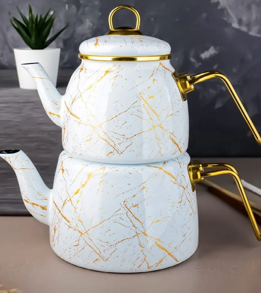 White Gold Marble Design Enamel Double Turkish Tea Pot Kettle