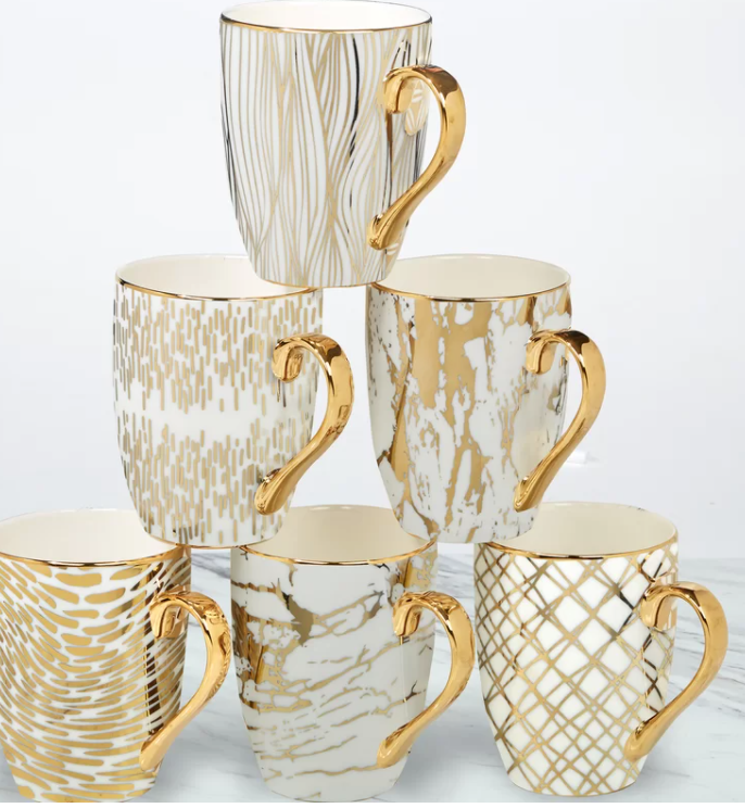 Set of 6: 16 OZ Gold Metallic Pattern Print Mugs