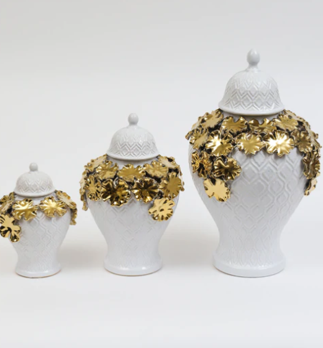 White Textured Ginger Jar with Gold Floral Design (3 Sizes)