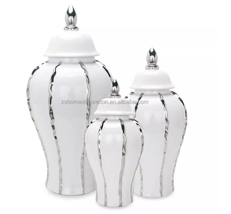 White and Silver Ginger Jar with Linear Design (3 Sizes)