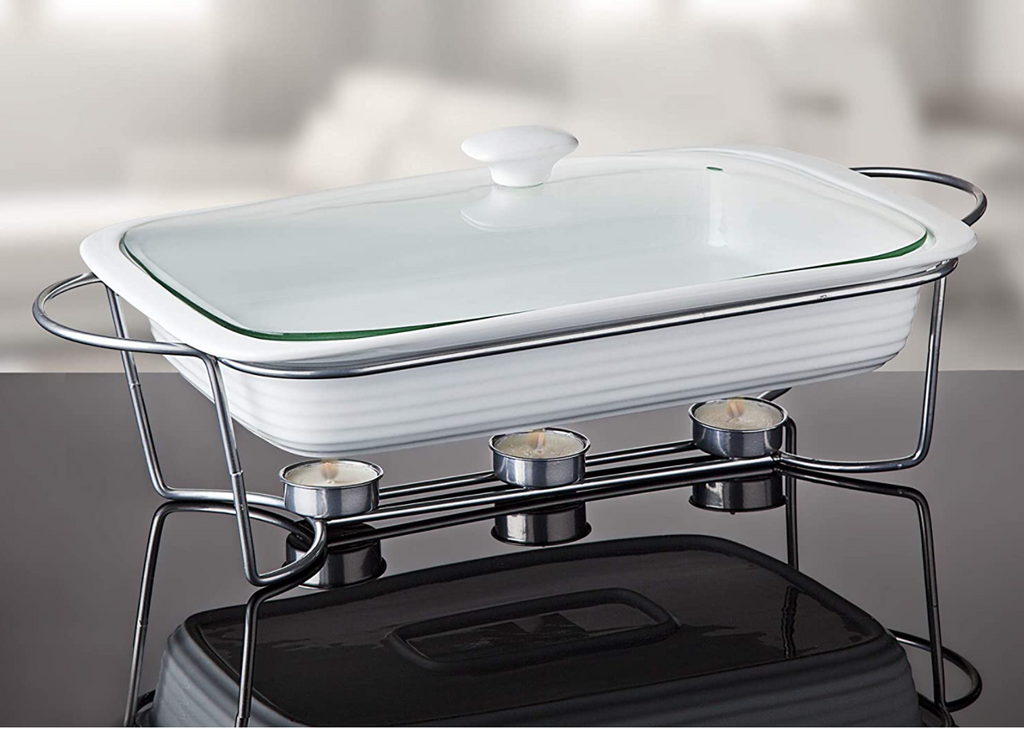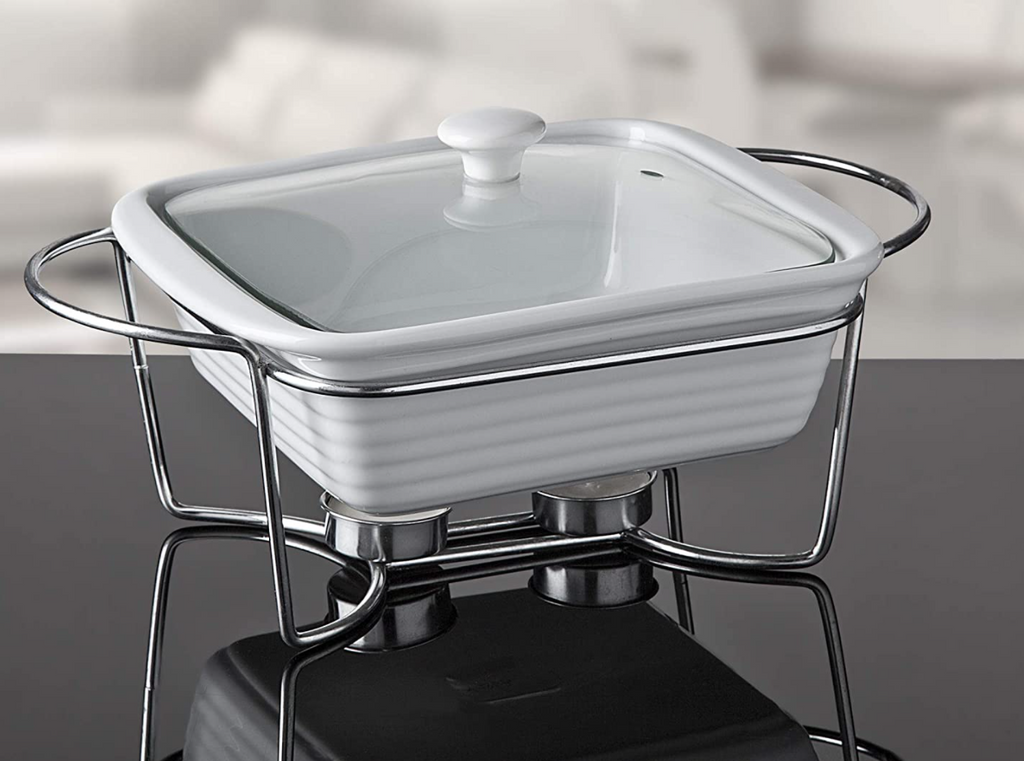 White and Silver Oven to Table Rectangular Baker/Warmer/ Serving Piece with Stand - 2 Quart