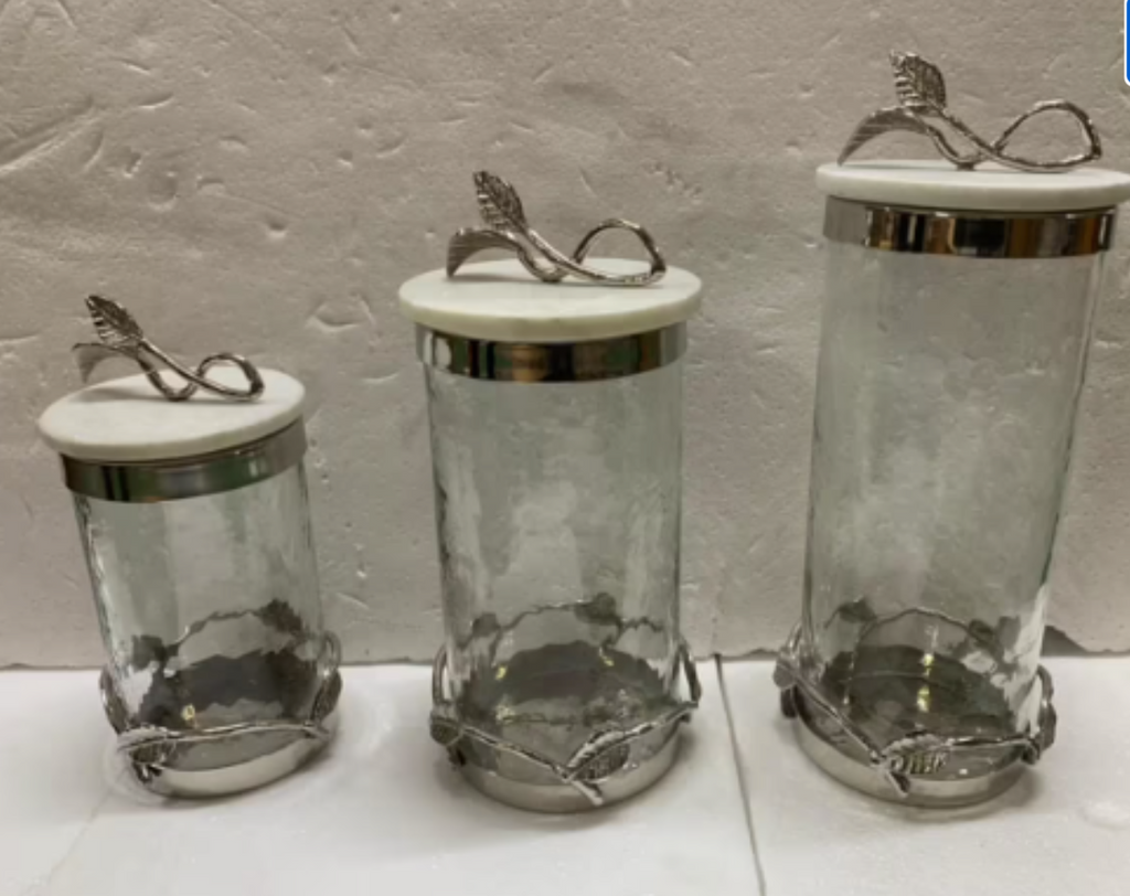 Silver Metal Leaf Branch w/ Marble Ball Lid Canisters- With metal rim SET of 3