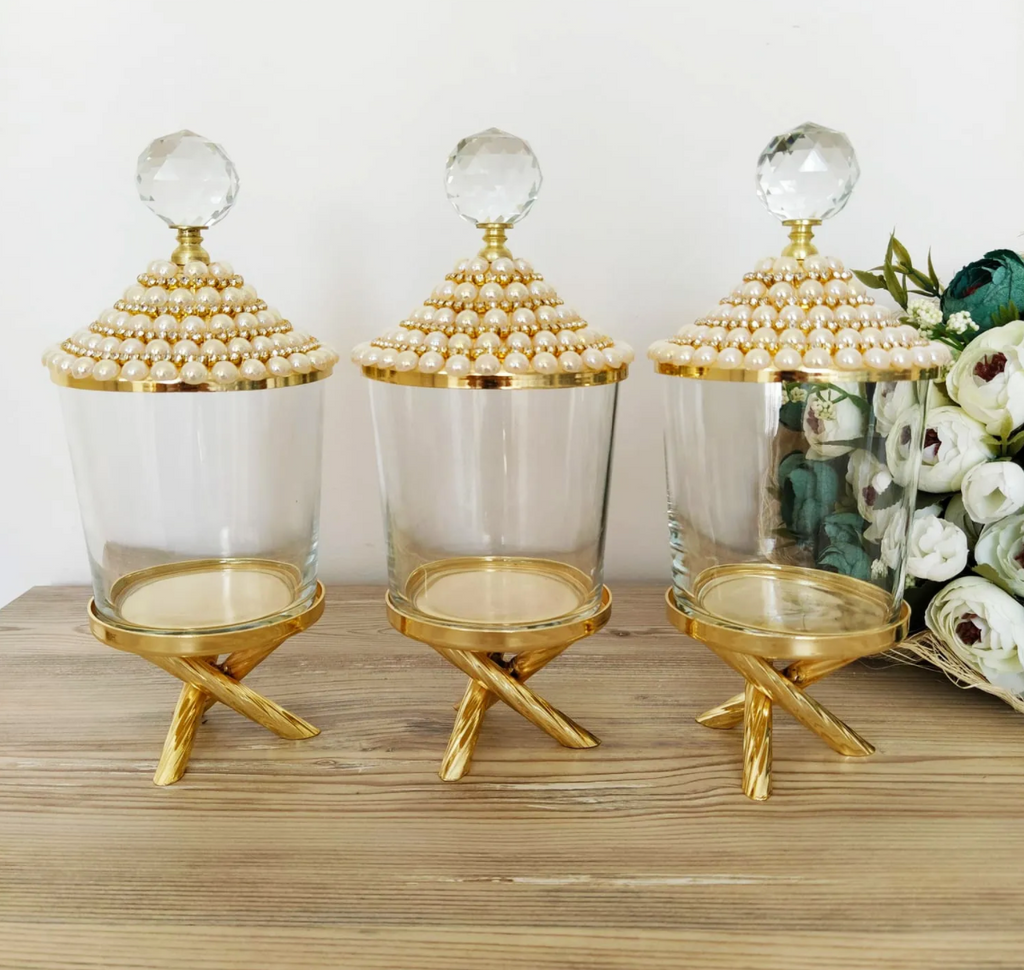 Pearl Gold Canister with Acrylic Ball Lid and Stand ( Set of 3)