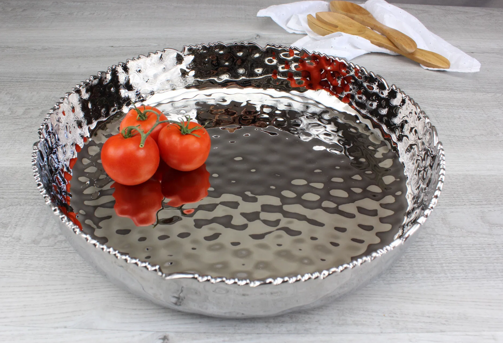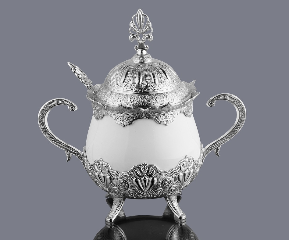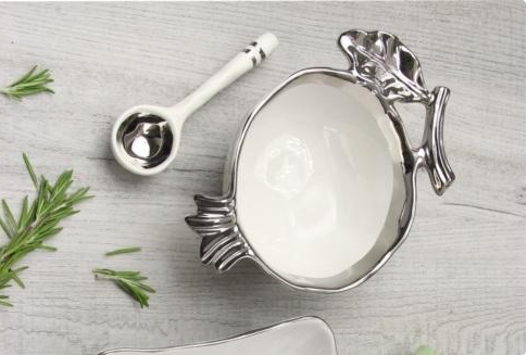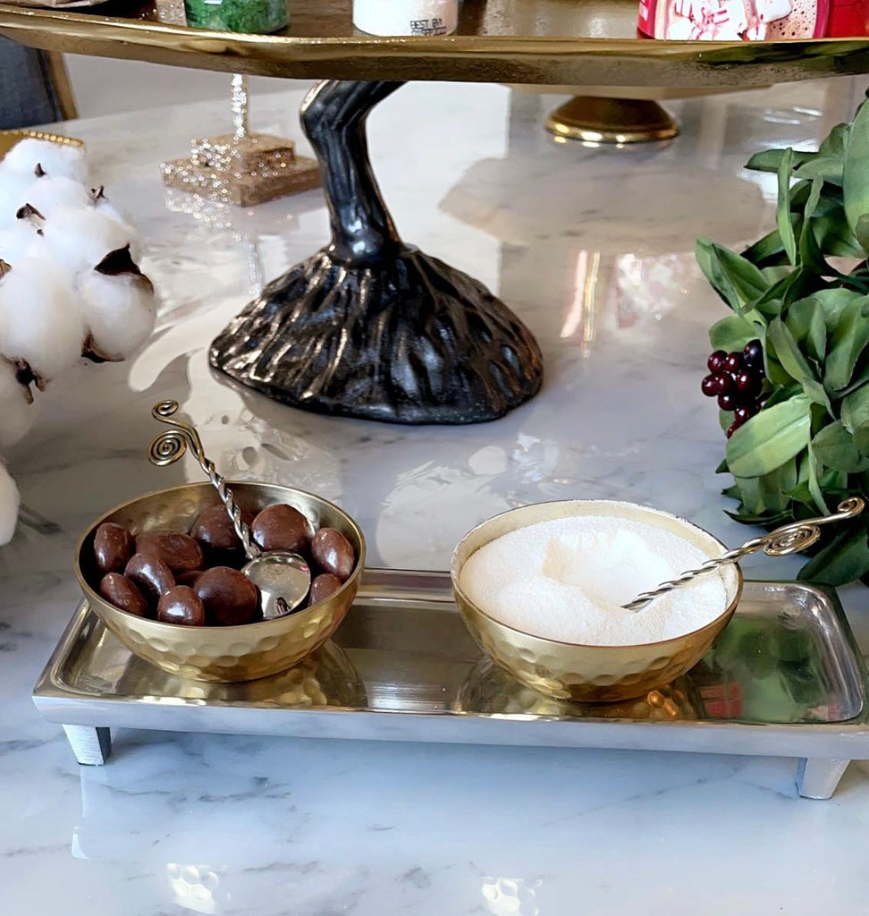SILVER TRAY WITH GOLD BOWLS W/ SPOONS