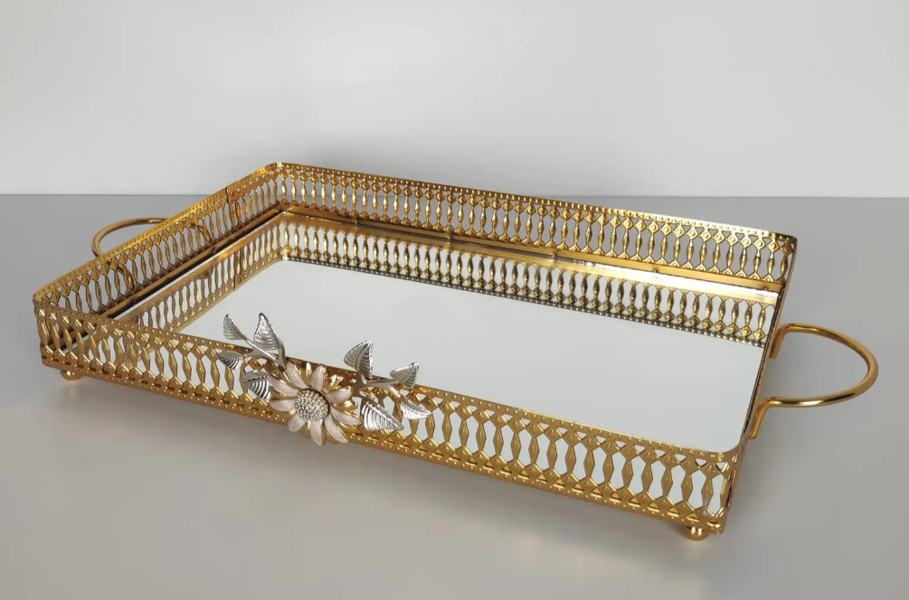 Gold Floral Mirror Tray with Handles (3 Sizes)