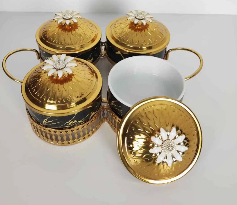 Black Marbleized Snack/Spice Tray With 4 Bowls and Lids