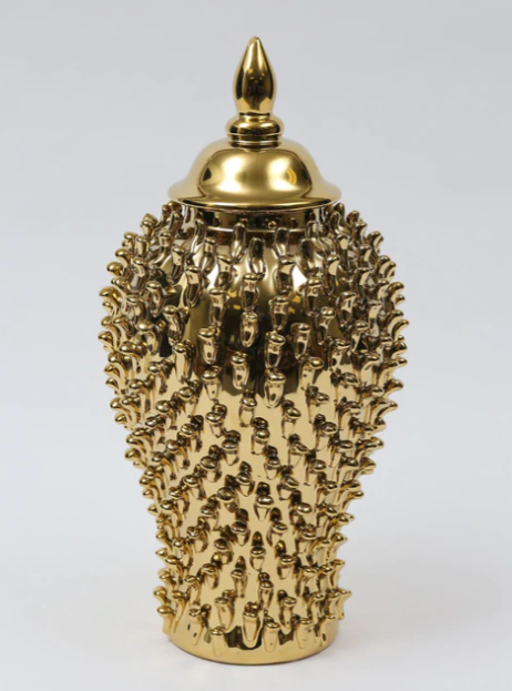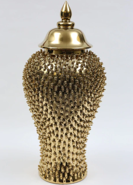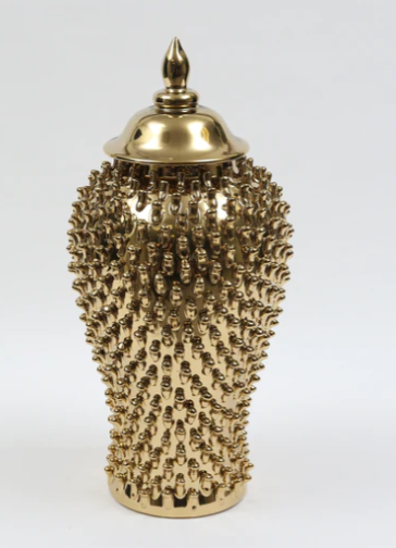 Description: This studded gold ginger jar has the perfect texture to fill your space. Comes in 3 different sizes and has an original beauty that is timeless and elegant.