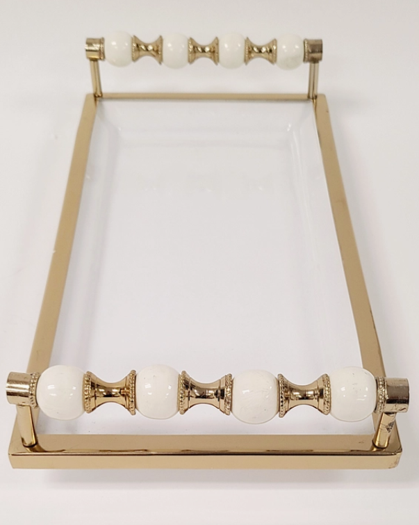 The modern simplicity of this white and gold beaded set makes it the ideal décor for a finely designed table. It is crafted from quality materials and is meticulously sculpted by professional artisans. This tray may be used as a serving or displaying tray.