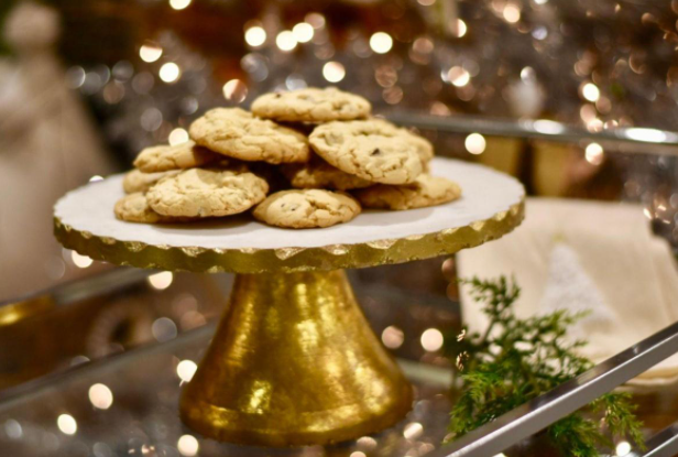 White marble cake server features textured raw edge with gold foil finish and foiled tin pedestal base with gold beaded edge. Knocks down for storage.