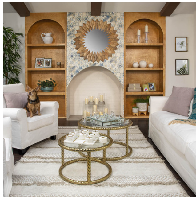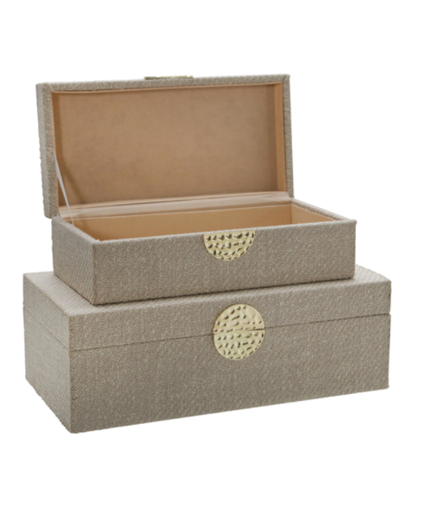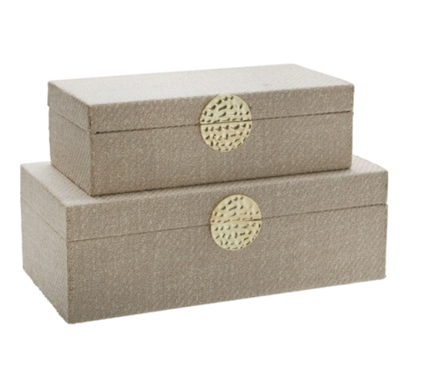 Description: This box set is beautifully patterned with a soft fabric overlay. The gold medallion on the front ties these back to all of your gold decor. Can be styled together, or separately, and they are great for storing things like remotes and other items.