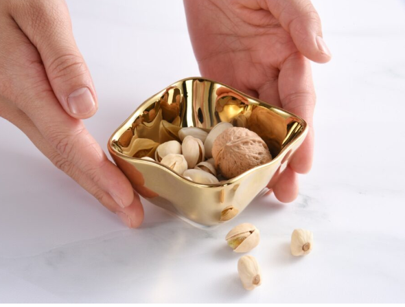 Description: .. This multi-purpose bowl can serve as a condiment bowl on your counter, an addition to a cheese board for honey, or to hold sugar at brunch. Crafted in a stunning white high-fired porcelain with gold titanium. Food safe, dishwasher safe, oven safe to 500°. Easy Care.