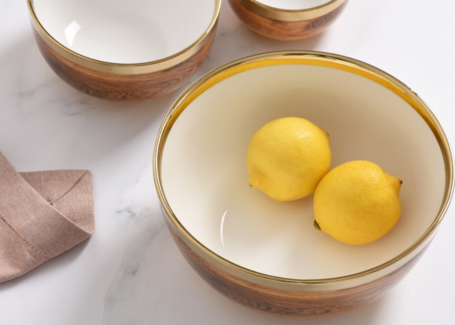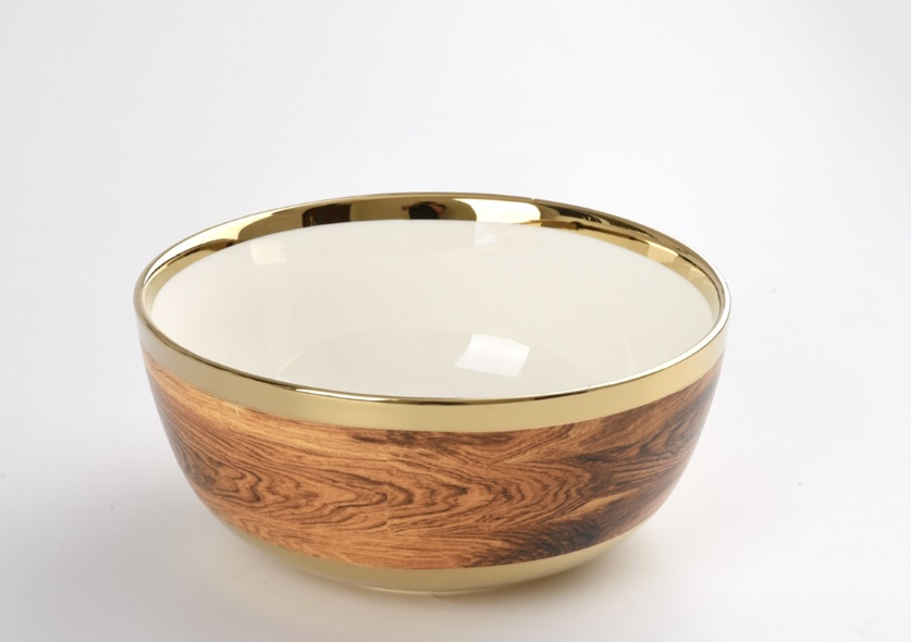 Large Bowl from our Madera Collection. Generously sized bowl for serving salads or side dishes like mashed potatoes, roasted vegetables, or rice! Stunning high-fired porcelain with a rustic wood design and gold-toned rim. Food safe, dishwasher safe, oven safe. Tarnish and stain-free. Easy Care.