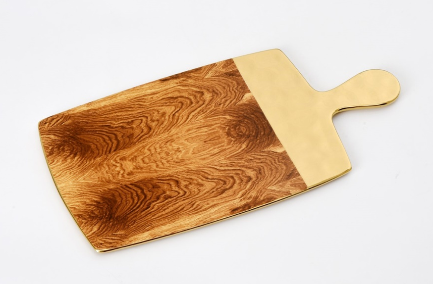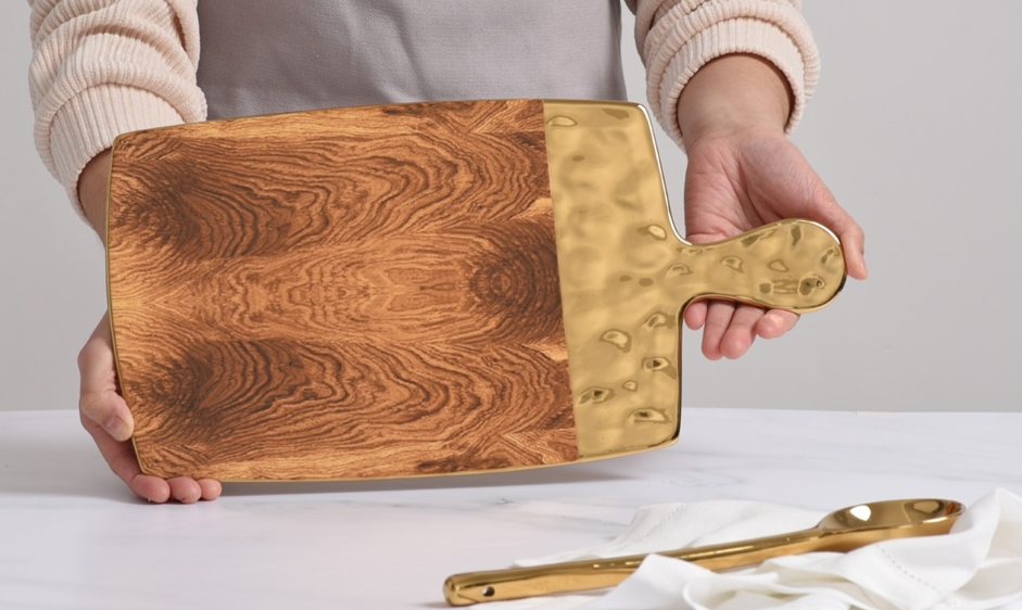 Look no further for the perfect Serving Board from our Madera Collection. Whether it is a charcuterie board for two or desserts for a few, this board is the ideal size for all casual parties. Slide this board in the refrigerator to chill and keep all your servings fresh and tasty. Stunning high-fired porcelain with a rustic wood design and gold-toned rim. Food safe, dishwasher safe, oven safe. Easy Care.