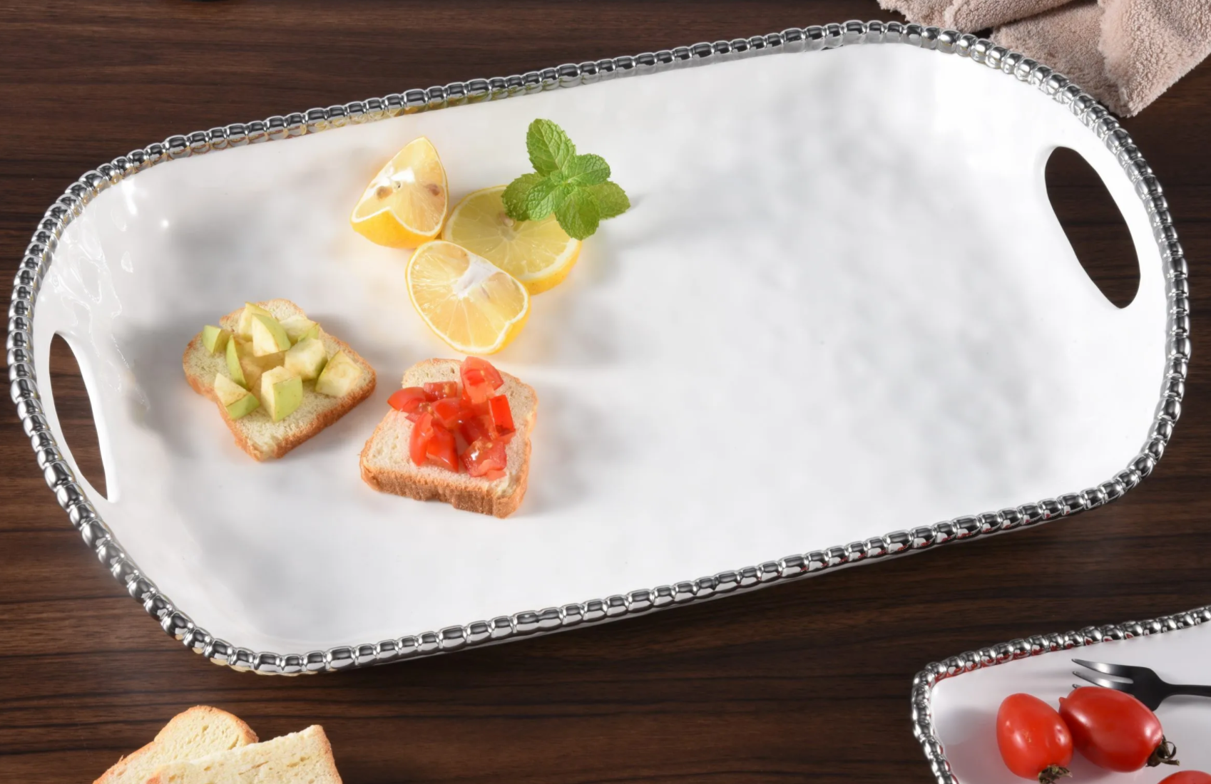 Silver and White Beaded Tray w/ Handle (Extra Large)