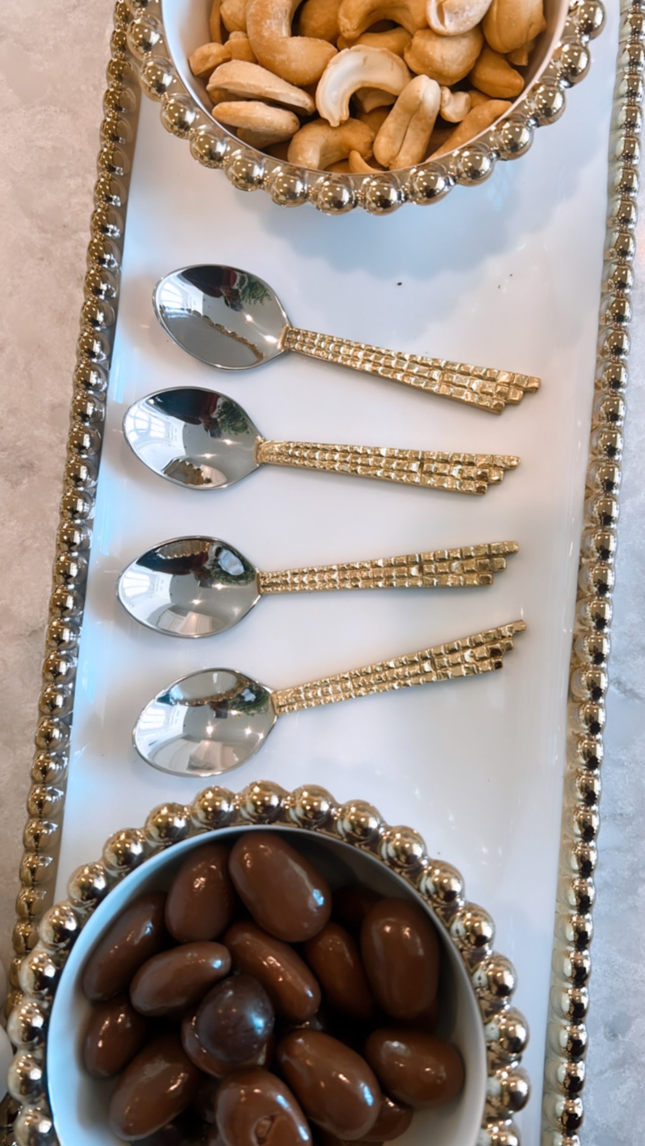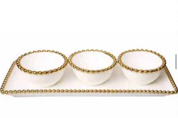 Gold Beaded Edge Serving Tray with 3 Beaded Snack Bowls