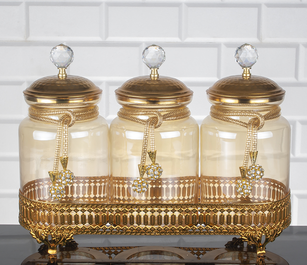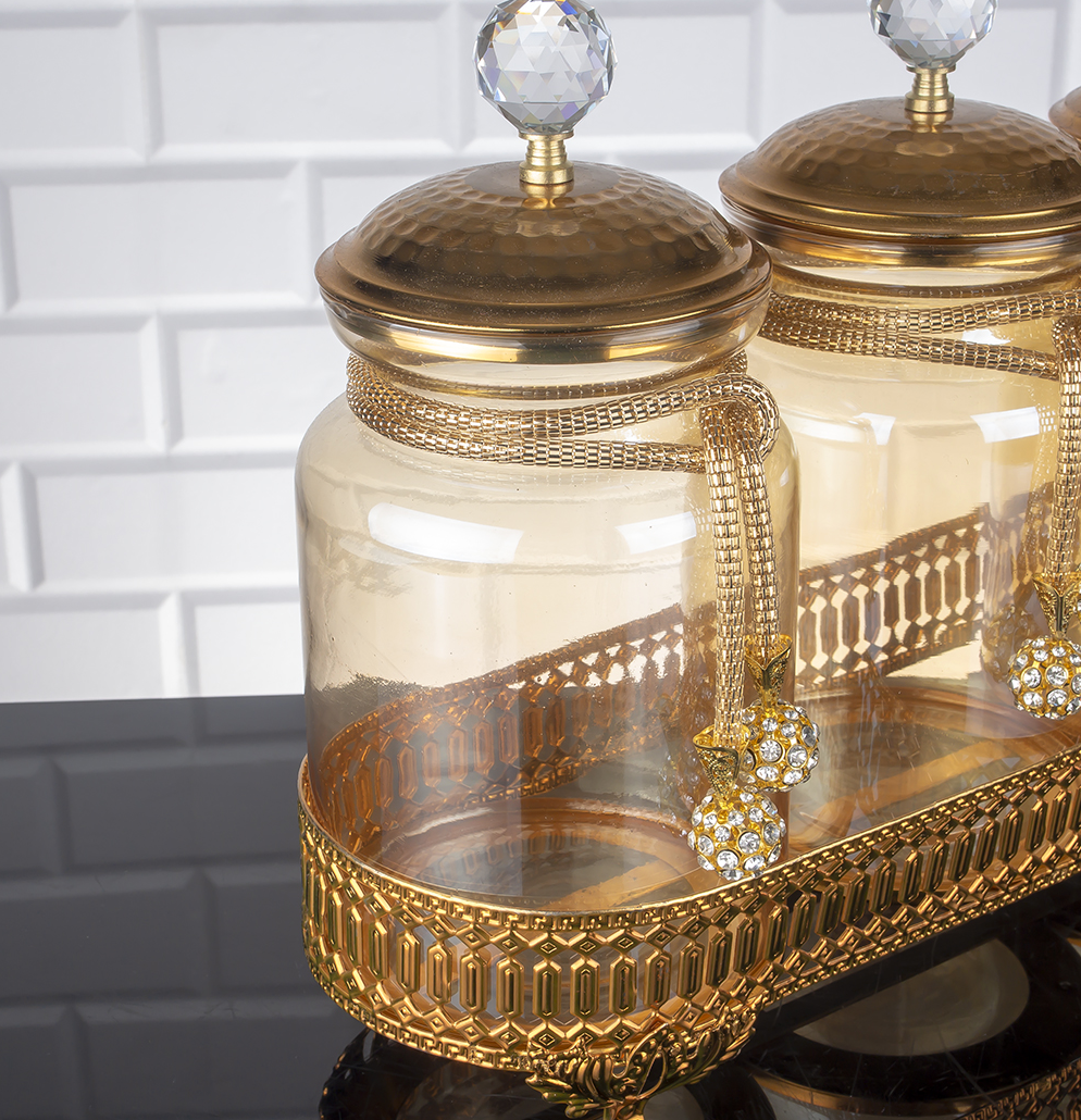 Description: This glass canister with a ARCRLIC lid features gold/SILVER designs to enhance your food display. Use it at a coffee station in conjunction with our other two canisters for a glamorous coordinating display. ORNAMENT DETAILS