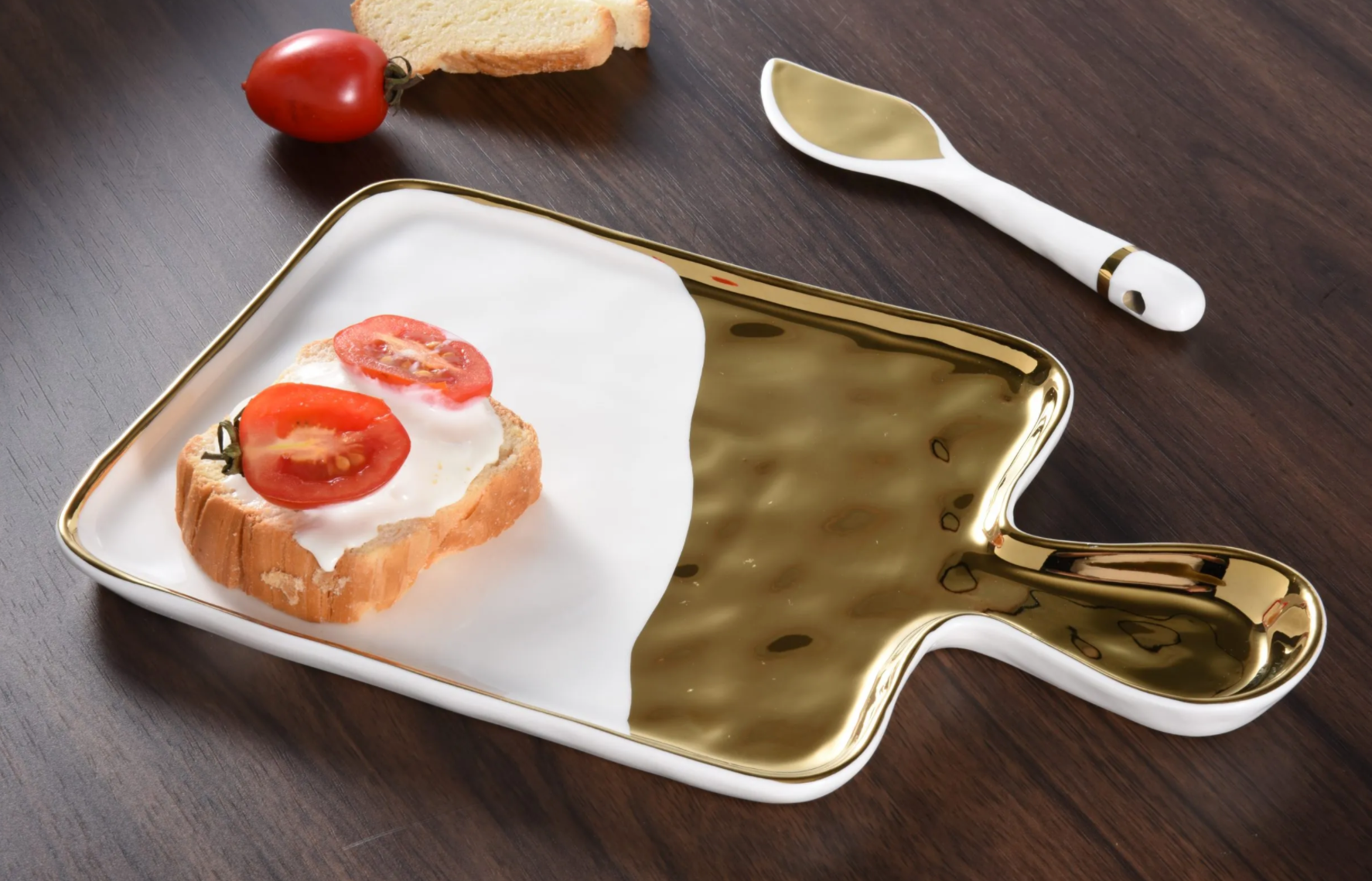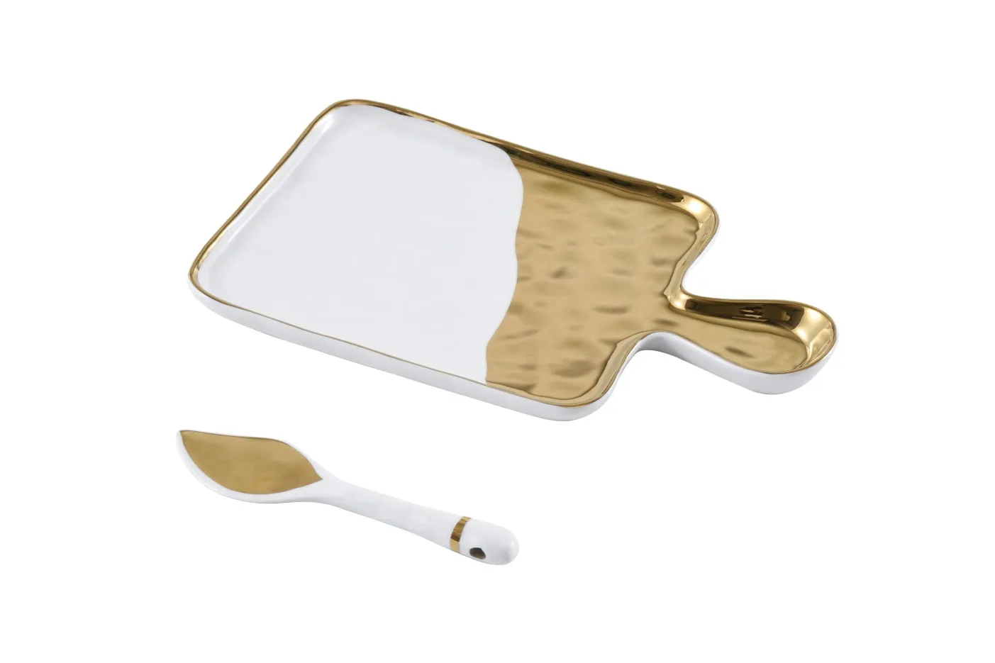 Description: Great for serving sliders, small sandwiches or other hors d’oeuvres! Both tray and spreader made of gorgeous white porcelain with gold titanium accents and trim. This paddle serving board will add unique elegance to your serving display!