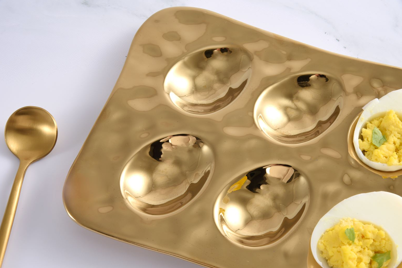 The perfect accompaniment to relaxed weekend brunches, annual Easter celebrations or a fun night in, our egg tray is a great centerpiece for more than just eggs! Use to display a dozen deviled eggs at brunch or your beautifully decorated Easter eggs. This tray also makes for a great sushi display for a fun night in. Chill in the refrigerator first to keep food fresh and tasty when served. Striking and elegant gold-tone titanium finished high-fired porcelain. Dishwasher safe, stain resistant, tarnish free, oven safe to 500°. Tarnish and stain-free. Easy Care.