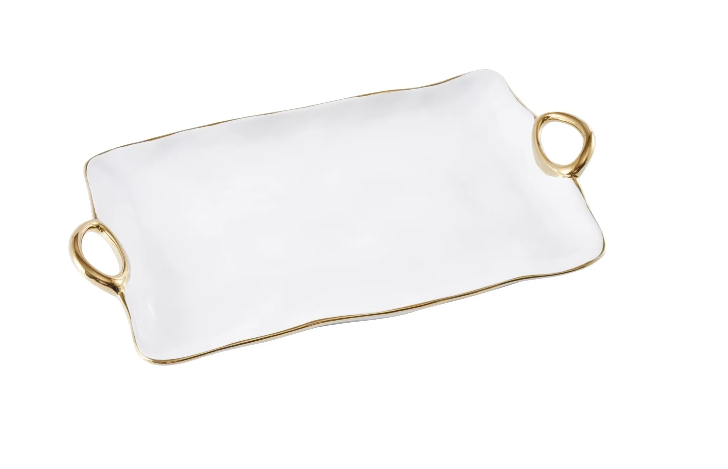 Description: Large Tray in Golden Handles. In casual and formal settings, this tray can be used to serve the main course, your favorite grilled vegetables or even dessert! Stunning white porcelain with smooth and fluent handles in gold titanium. Food safe, dishwasher safe, oven safe to 550°. Easy Care.