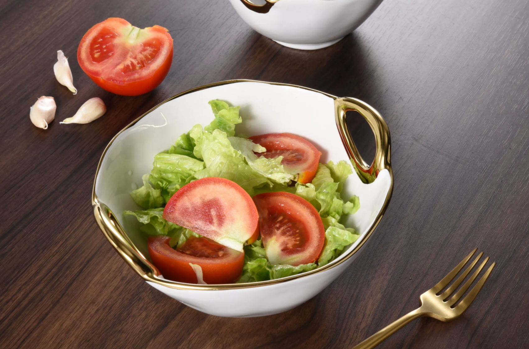 Description: Medium Bowl in Golden Handles. Whatever you are serving, from salads to sides, they will look even more appetizing in this beautiful bowl. Stunning white porcelain with smooth and fluent handles in gold titanium. Food safe, dishwasher safe, oven safe to 550°. Easy Care.