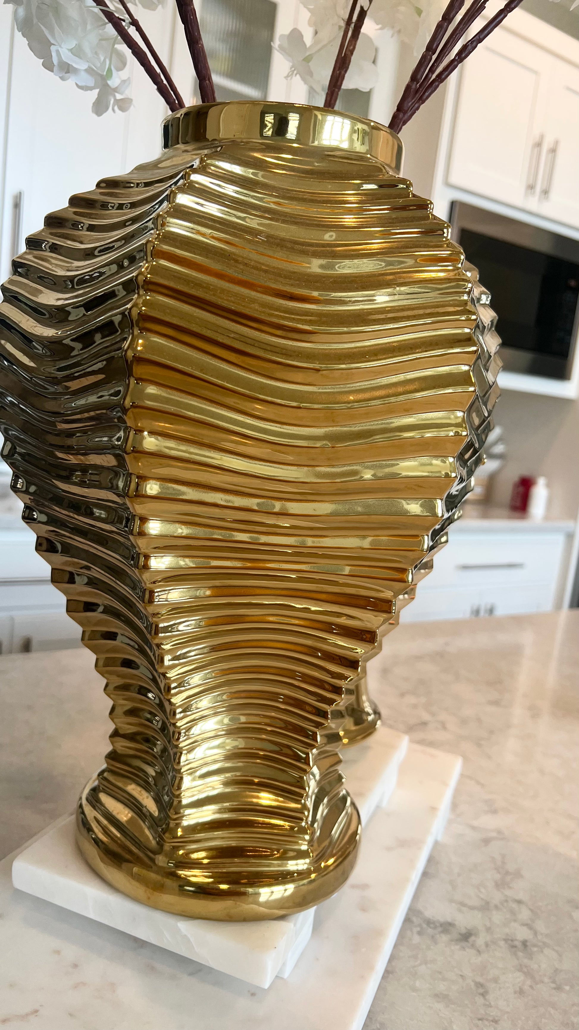 Description: This studded gold ginger jar has the perfect texture to fill your space. Comes in 3 different sizes and has an original beauty that is timeless and elegant.