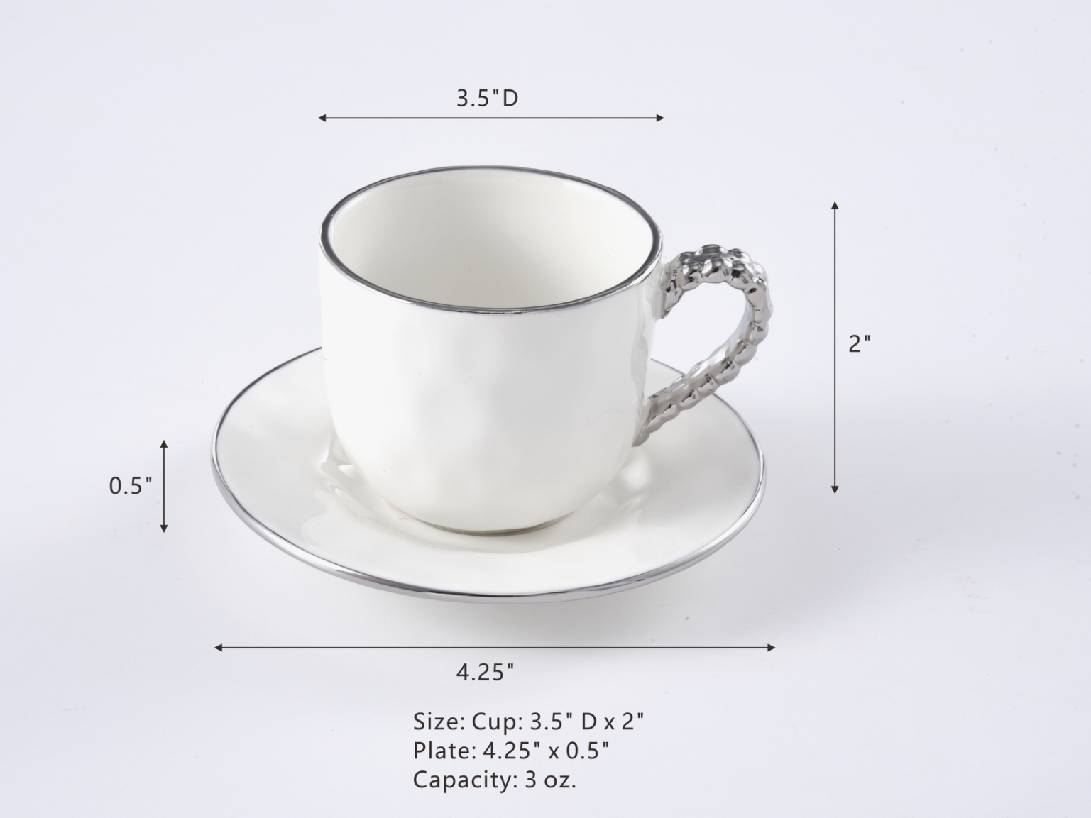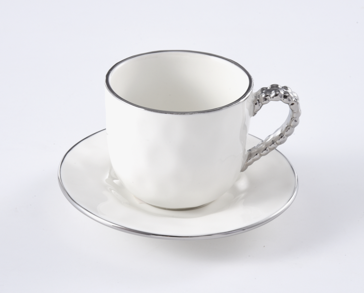 Description: This beautiful cup and saucer is made of elegant porcelain and finished with a stunning beaded handle! Serve yourself a relaxing drink with a stylish teacup!